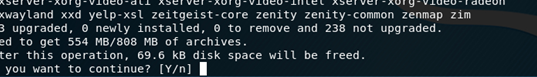 注:提示是否?、继续执行升级过程?并显示需要升级的大小及额外需要的空间大小。直接回车。