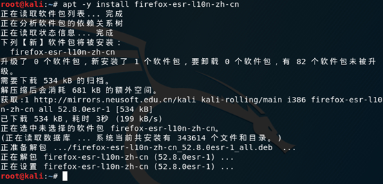 1、 打开终端,输入 apt -y install firefox-esr-l10n-zh-cn,(下载安装语言包)。