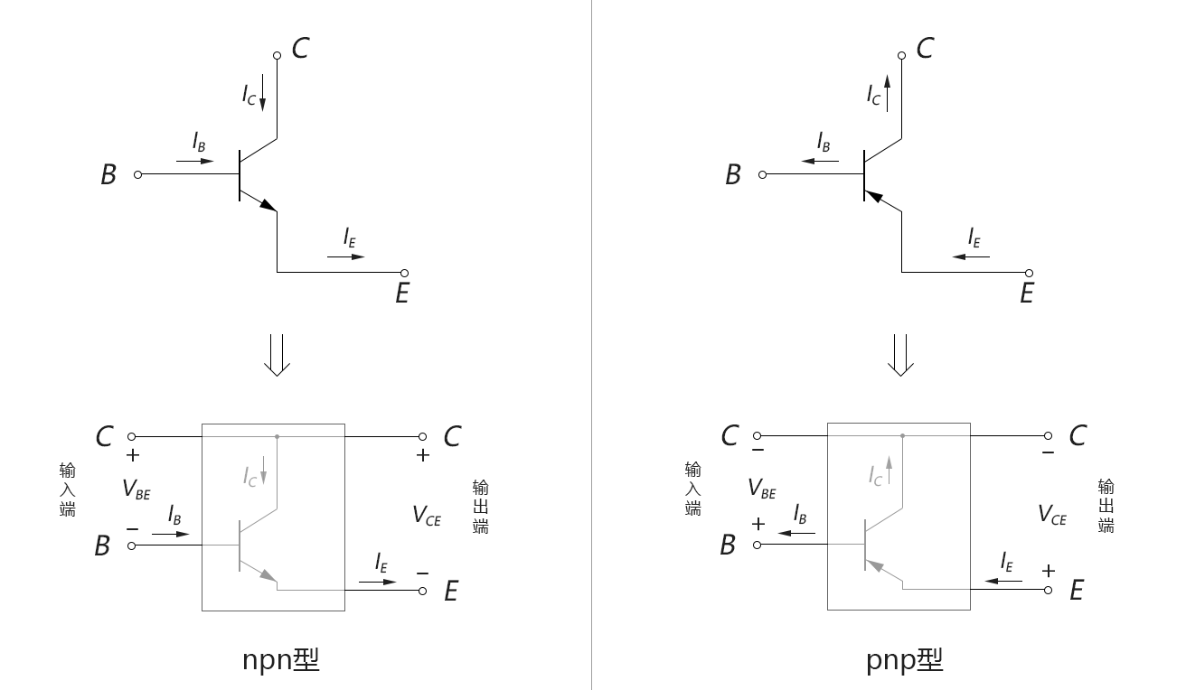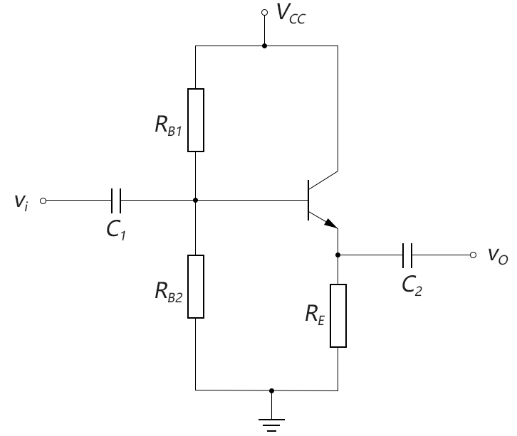 在共集组态中,“输入端口”和“输出端口”共用BJT的集电极端子(故称为“共集”),形成一个双端口网络,如下图所示: