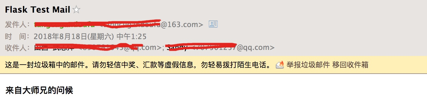 >>> msg = Message('Flask Test Mail', sender='发件人', recipients=['收件人1','收件人2'])