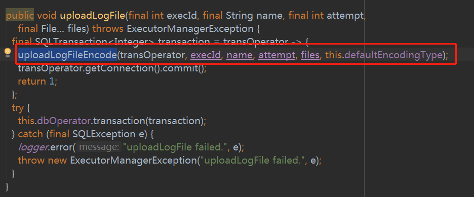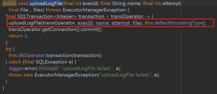 这里有解压,那在入库之前肯定会有压缩过程,再找到入库的方法(如何触发将本地文件写入到数据库在这里不讨论)uploadLogFile(ExecutionLogsDao方法中)