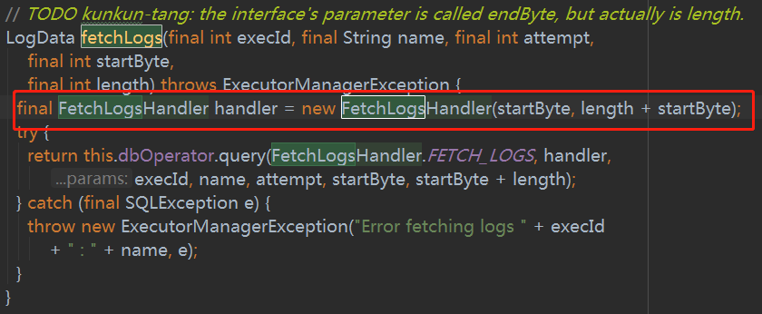 二.对于运行完成的,日志会被写入数据库,而且是经过压缩的,方法为 package azkaban.executor下的ExecutionLogsDao 搜索找到fetchLogs,在方法体中实例化了一个FetchLogsHandler