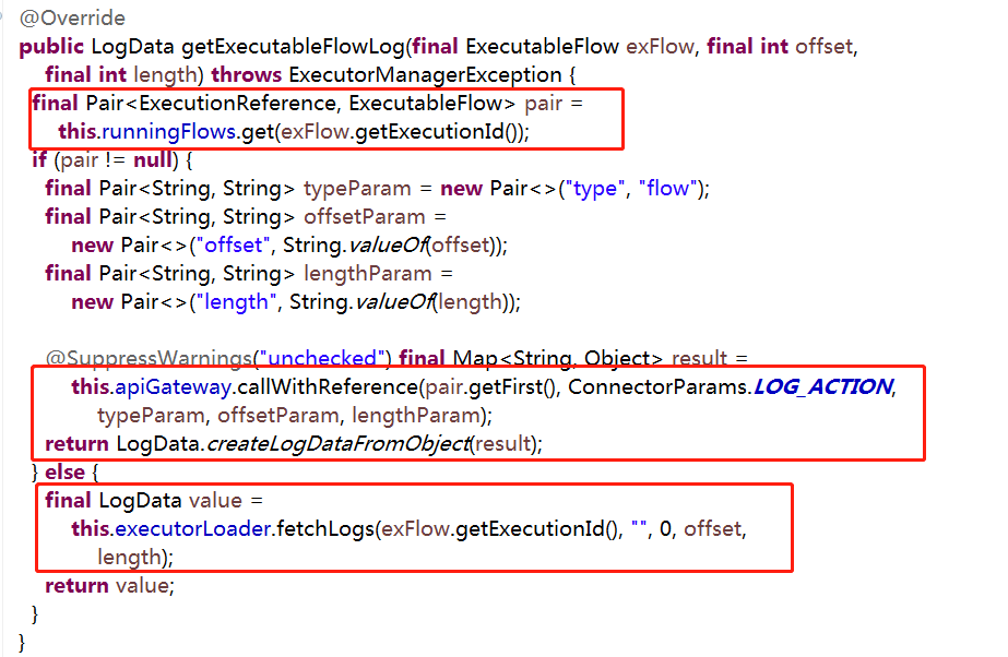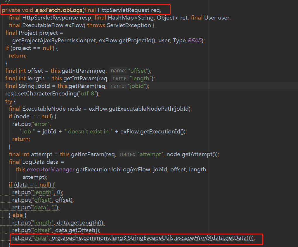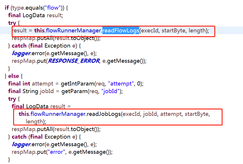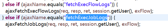 对应的处理方法为 ajaxFetchJobLogs(req, resp, ret, session.getUser(), exFlow)和ajaxFetchExecFlowLogs(req, resp, ret, session.getUser(), exFlow)