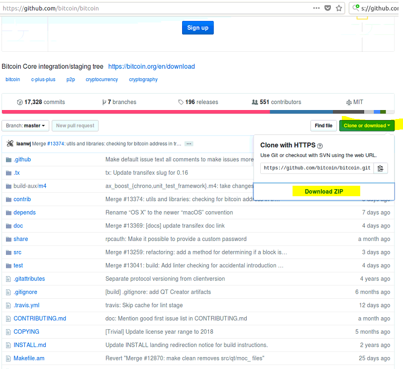 如果git clone太慢,可以直接上该网址将源码download下来,然后创建文件夹bitcoin,解压到其中。