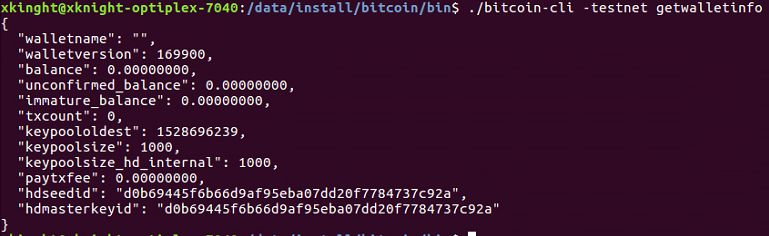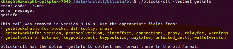 ./bitcoin-cli -testnet getinfo (该命令已在version 0.16.0去除!所以新版本,没有此命令!)