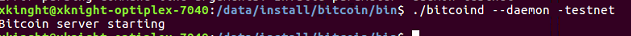 1 cd /data/install/bitcoin/bin/ 2 ./bitcoind --daemon-testnet (网友提醒,新版本命令为:./bitcoind -testnet,请读者自测!)