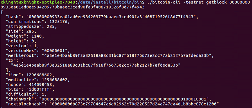 ./bitcoin-cli -testnet getblock 000000000933ea01ad0ee984209779baaec3ced90fa3f408719526f8d77f4943