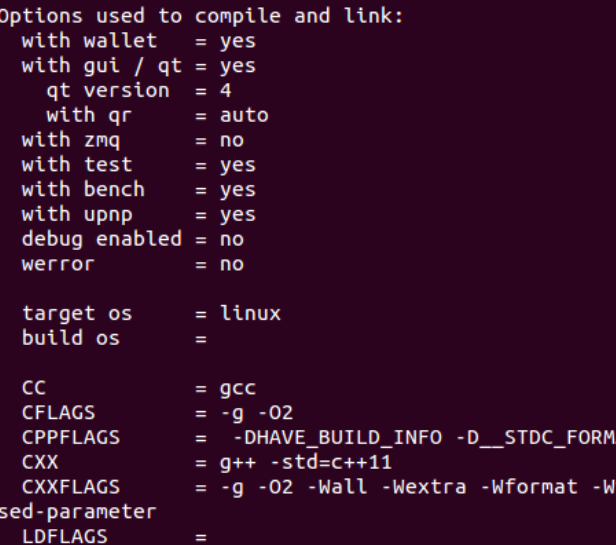 执行完.configure之后需要看看是否有相应的错误信息或者WARNING。一般warning是可以允许的,不影响主要功能使用。但是我们最好逐一排除警告。(若只分析bitcoind代码,可以忽略此部分。)