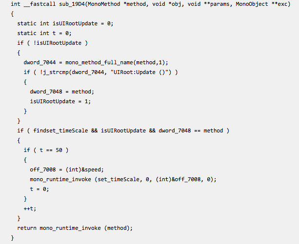 再通过hook的第二个函数mono_runtime_invoke,进行调用该方法,将设置的参数传入,通过对游戏时间流速的更改设置,达到加速器的作用。