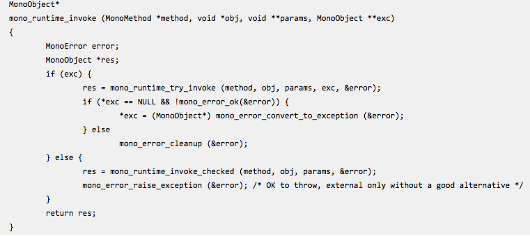 深入分析跟进,发现游戏进程在启动时,会加载多个新的动态库,其中包括了libsubstrate.so(此为一个著名的Hook框架,接着分析找到了他通过调用框架Inline Hook了libmono.so导出的两个方法,Hook的方法mono源码参考如下: