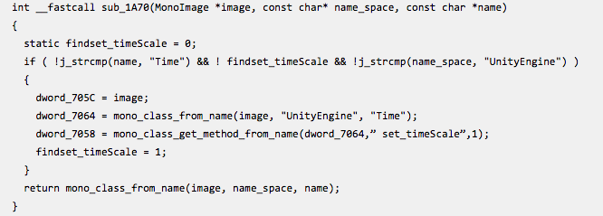 通过启动进程后附加,获取到Hook调用的函数,通过分析得知,mono_class_from_name函数是mono在解析DLL方法时会经过的一个函数,hook此函数后,在调用前,对参数中方法名、命名空间进行判断,最终通过调用mono_class_get_method_from_name获取到UnityEngine.Time.set_timeScale方法,该方法的作用便是设置游戏时间的流速。