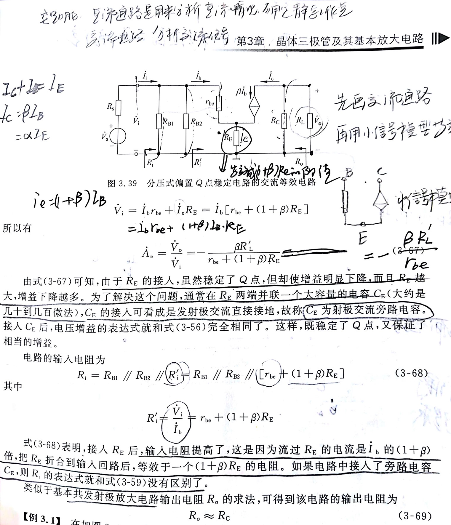 画出交流的等效图,用小信号模型代替三极管,分析各项参数,此部分较为熟练,结合实际应用电路分析一个模型即可。