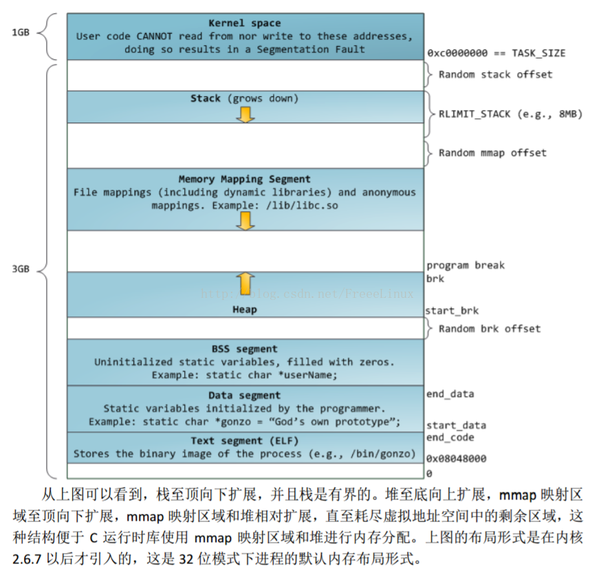 从进程地址空间的布局可以看到,在有共享库的情况下,留给堆的可用空间还有两处:一处是从.bss段到0x40000000,约不到1GB的空间;另一处是从共享库到栈之间的空间,约不到2GB。这两块空间大小取决于栈、共享库的大小和数量。这样来看,是否应用程序可申请的最大堆空间只有2GB?事实上,这与Linux内核版本有关。在上面给出的进程地址空间经典布局图中,共享库的装载地址为0x40000000,这实际上是Linux kernel 2.6版本之前的情况了,在2.6版本里,共享库的装载地址已经被挪到靠近栈的位置,即位于0xBFxxxxxx附近,因此,此时的堆范围就不会被共享库分割成2个“碎片”,故kernel 2.6的32位Linux系统中,malloc申请的最大内存理论值在2.9GB左右。