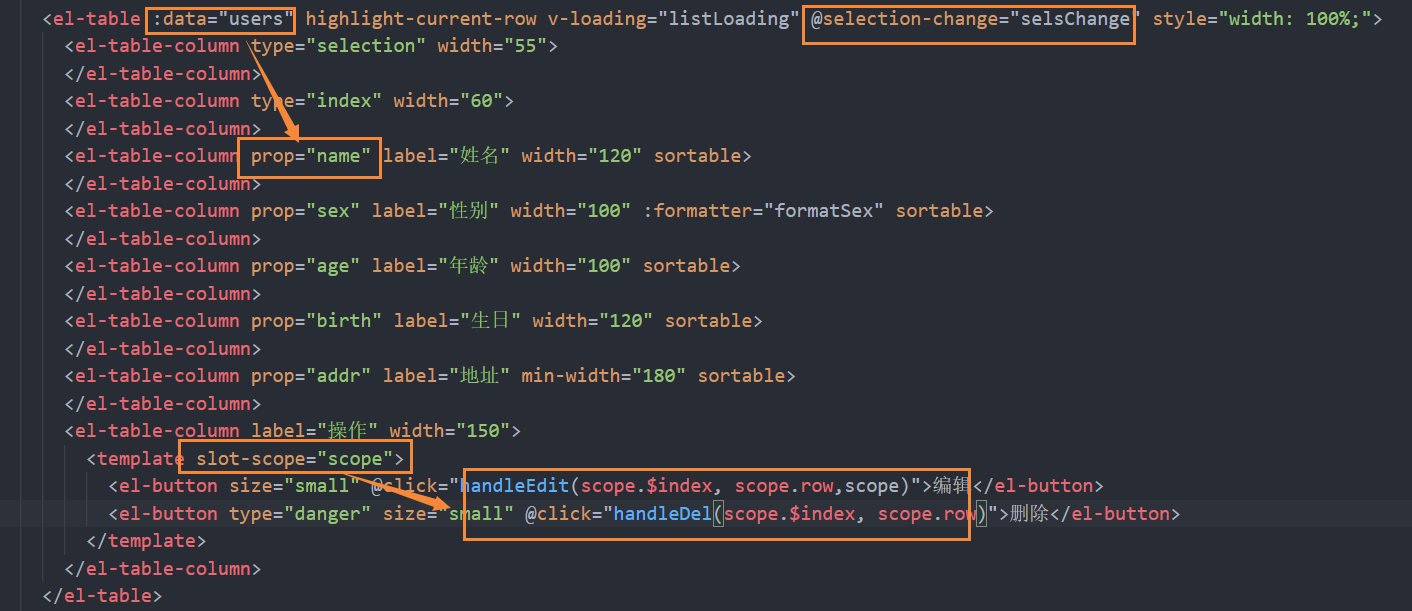 注意这个表格的代码,借助ElementUI的帮助,可以直接在data属性注入数据,然后在<el-table-column>中通过为prop设定对应键名来填充数据。