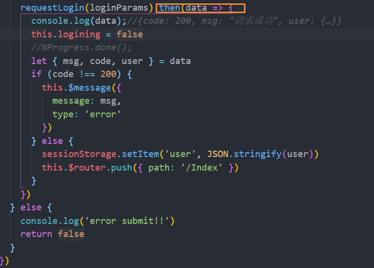 随后会调用login.vue中、定义在requestLogin()方法后的then()方法,解构赋值后根据code值判断验证的成功还是失败