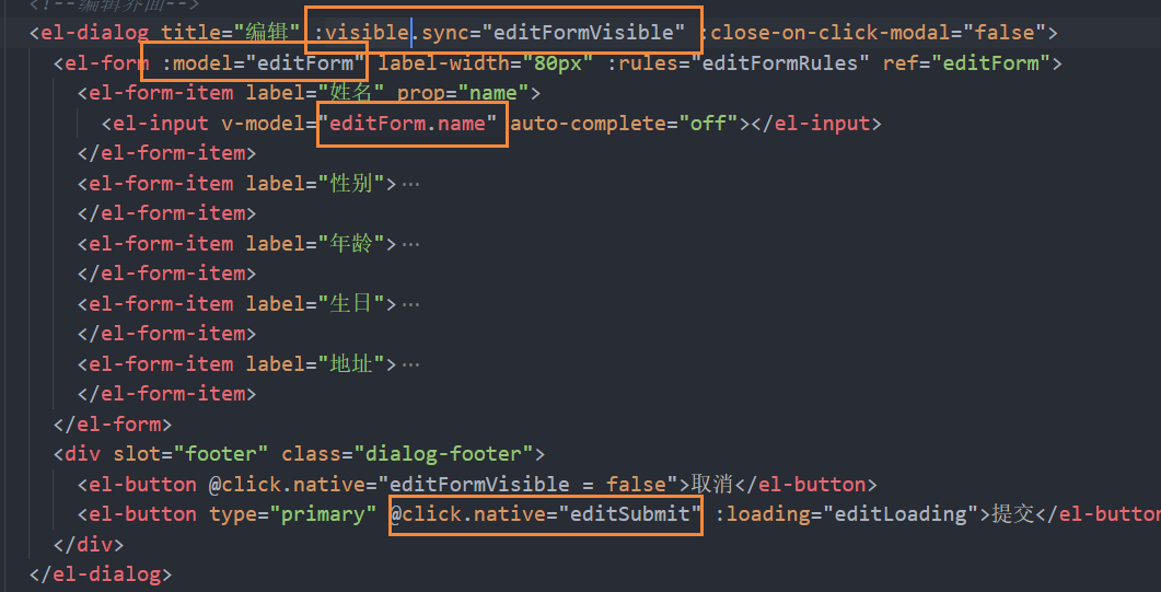 注意这里的 :visible.sync="editFormVisible",建议去学一下.sync的用法,这里指稍微提一下