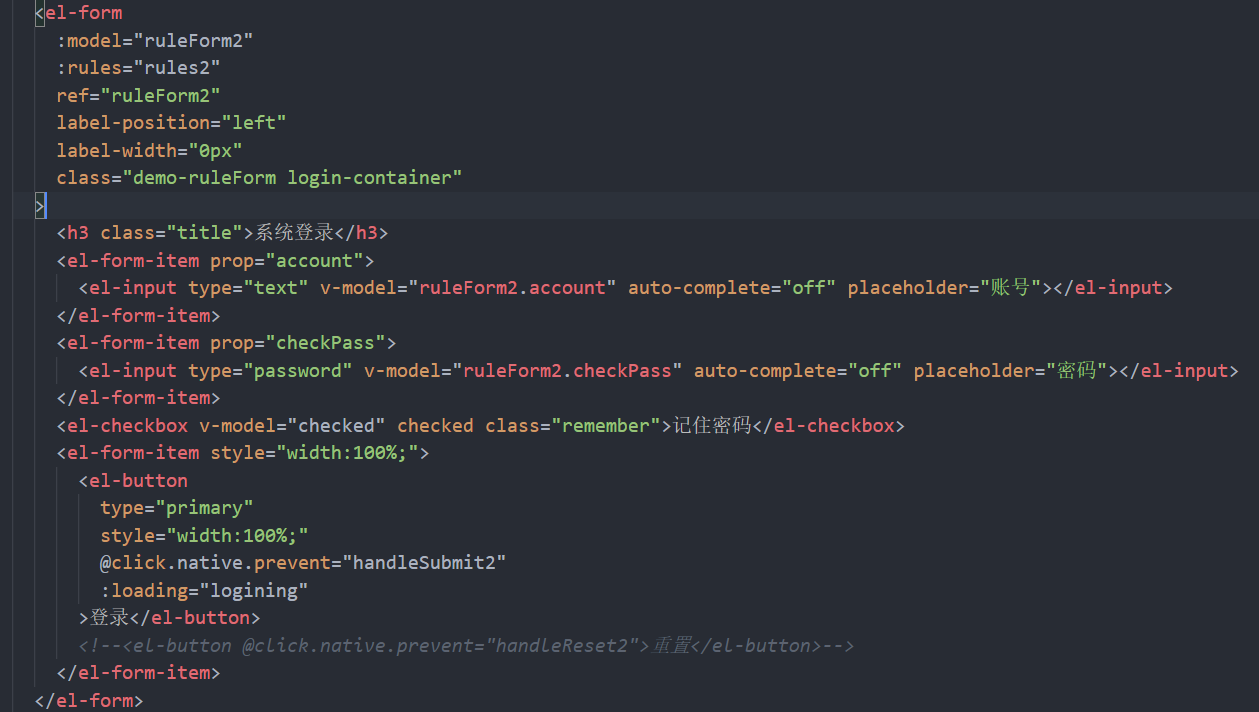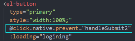 登录按钮:使用native修饰符,否则无法监听到原生click事件(被封装过的),再阻止默认事件提交,并调用handleSubmit2()事件: