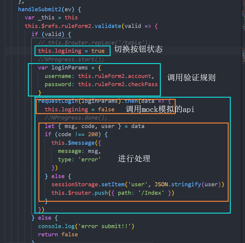 (login.vue)点击按钮后将调用requestLogin()方法,账号密码以POST方式发送至代理的接口地址('/login')