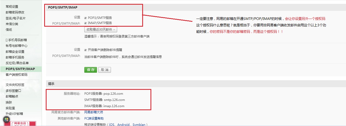 特别要注意我附加在页面上的文字,网易会在开通这些功能的时候让你另外设置一个授权码!!这个授权码是当你在使用非网易客户端时,启用pop/smtp/imap几个功能时候的密码!!