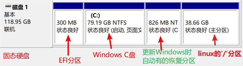 Windows 10 大概80G(固态里)(EFI分区和MSR分区也在这里,但下图中MSR分区没显示出来);