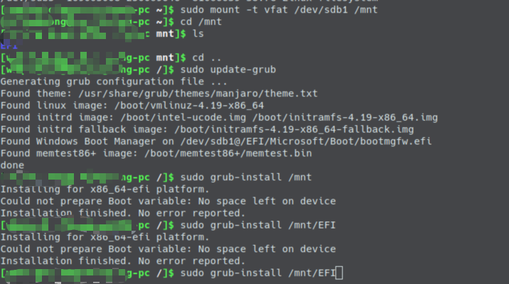 # rm /sys/firmware/efi/efivars/dump-* - 然后在root模式下(或者普通用户用sudo来更新grub):
