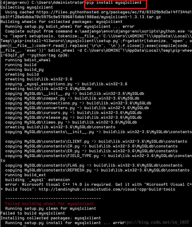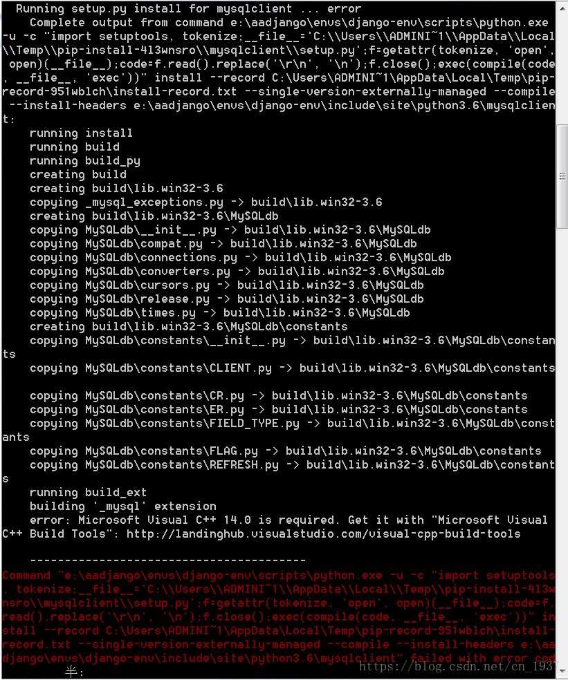 在我虚拟工作环境中使用pip install mysqlclient安转,出现以下问题: