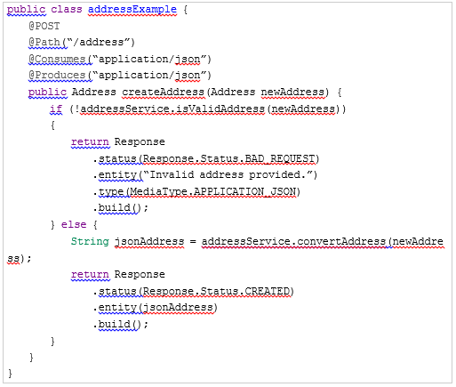在上面的示例中,使用isValidAddress()方法验证newAddress对象(从JSON编组到Address Java对象)。如果地址无效,则向用户返回HTTP 401(错误请求)代码,文本显示为“提供的地址无效。” 如果认为该地址有效,则convertAddress()将执行必要的操作,然后将包含地址内容的JSON格式的字符串返回给用户,以及一个HTTP 201(创建)返回代码。
