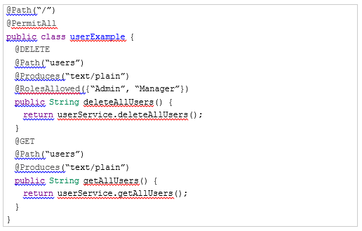 在下面的简单Java示例中,只有Admin和Manager角色(即组)的成员可以执行删除所有用户的DELETE请求,但是所有用户都可以执行GET请求以获取用户列表: