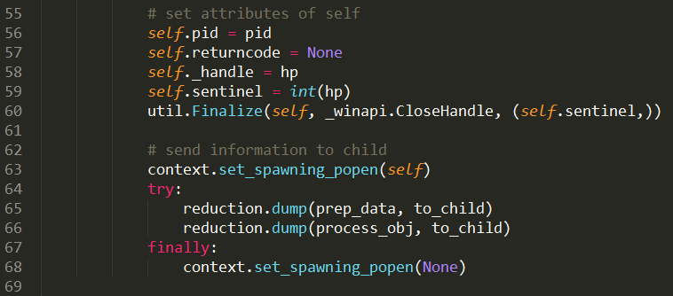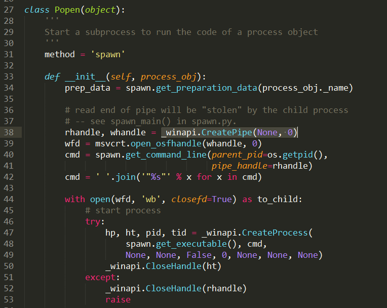 Process是一个高度依赖继承的类———其父类是BaseProcess,如图3 Process类的定义。在使用过程中先初始化一个Process实例,然后通过Process.start()来启动子进程。我们继续看关于Process.start()的定义,如图4 BaseProcess类中的start()定义。在其中第105行,调用了self._Popen(self),该函数重定义定义于Process类。该函数按调用顺序最后会跳转到 popen_spwan_win32.py 文件中的Popen类,如图5 Popen类的定义。Popen类在初始话过程中首先调用windows相关接口,生成一个管道(38行),取得对管道读写的句柄,然后生成一个命令行的字符串列表——cmd,如下: