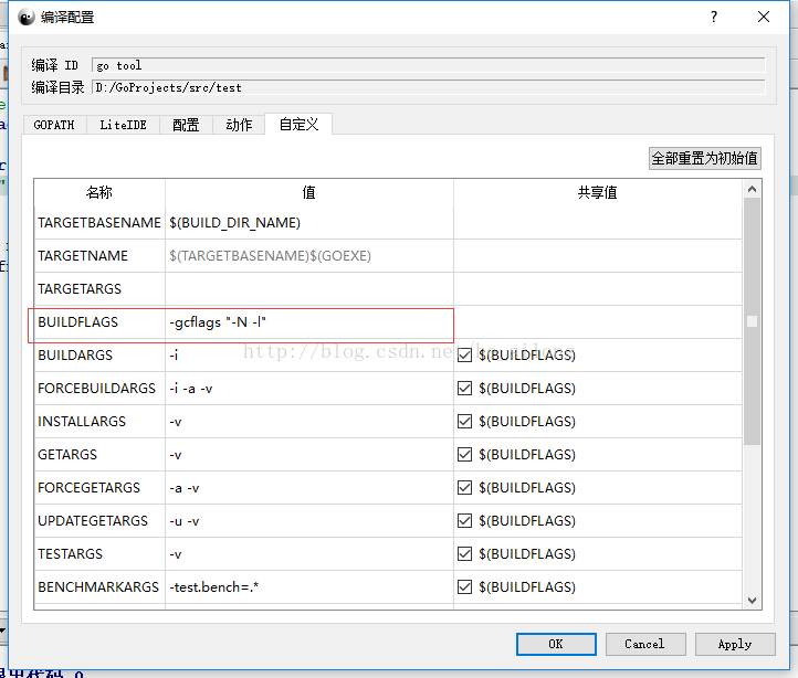BUILDARGS 设置为 -gcflags "-N -l",以去掉编译优化,方便调试。