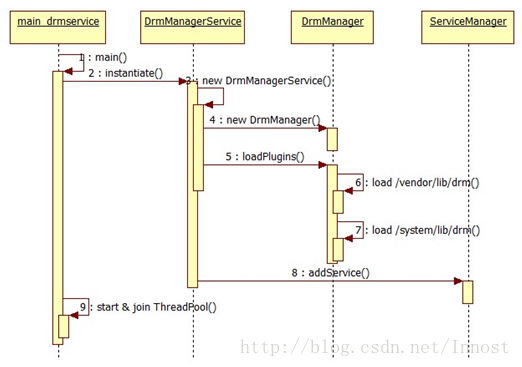 - DrmManagerService实例对象由drmserver进程在main函数中调用instantiate创建。