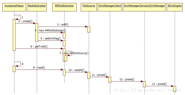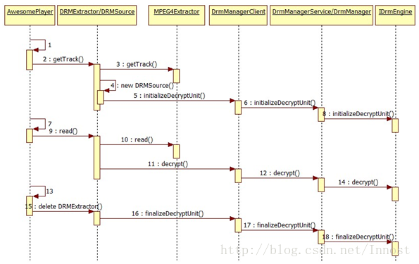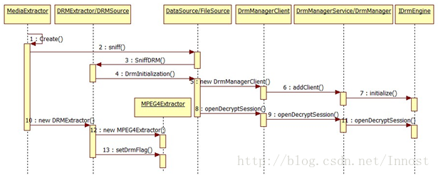 - SniffDRM将调用DataSource中的DrmInitialization函数,从而在DataSource中创建一个DrmManagerClient实例。如此,MediaExtractor就将DataSource与DrmManagerService联系起来。