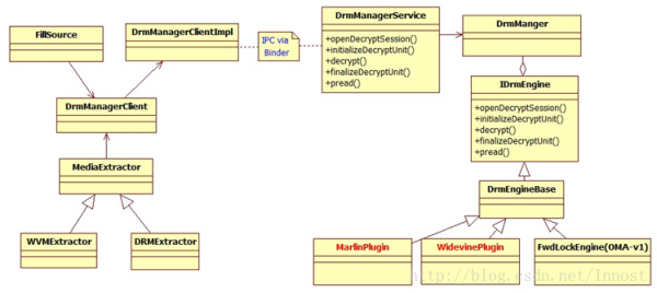 - DRM Framework API模块通过Binder机制和位于drmserver进程(以Android 4.1为例,drmserver的代码位于framework/av/drm/drmserver)中的DRM Manager模块通信。DRM Manager加载并管理系统中所有的DRM插件。