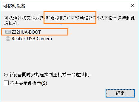 3、将Z32模块连进虚拟机中,无法连进虚拟机时,可以根据提示选择虚拟机->可移动设备。选择Z32HUA-BOOT来,连接到Z32。