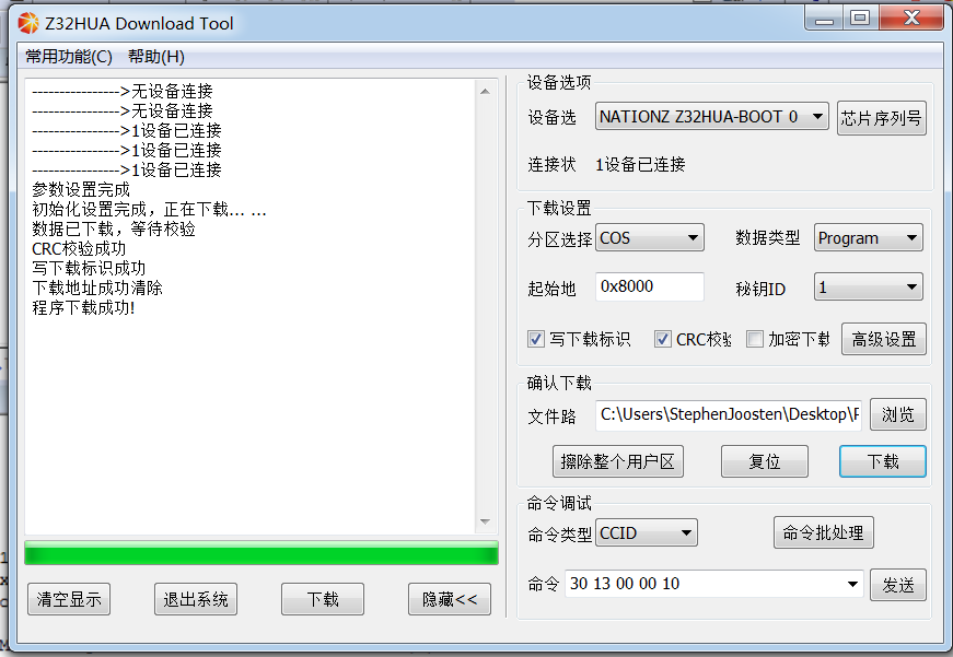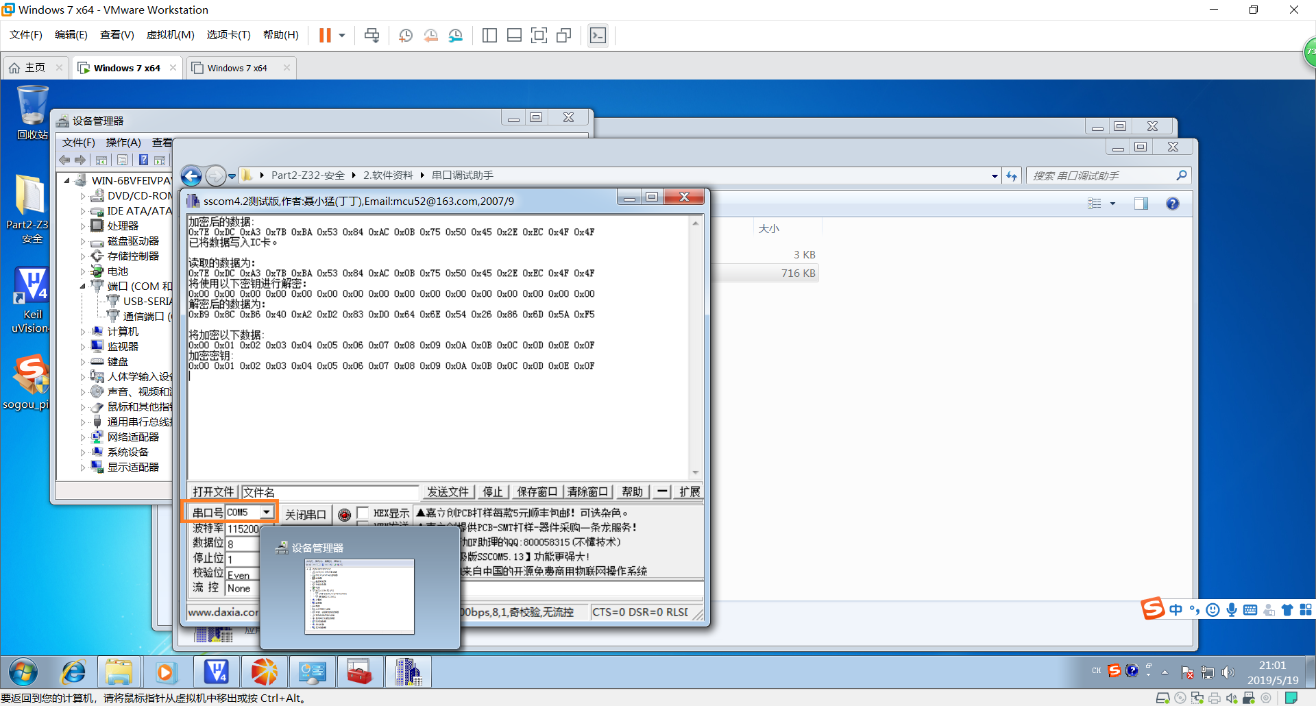 1、打开“Z32开发指南\实验8-SM1”目录的工程文件。编译工程,产生后缀名为.bin的可执行代码。 2、下载程序。 3、实验8的内容是SM1加解密实验,待加密的原始数据以及加密秘钥已经内置到程序中,修改UINT8 jiamiqian[16]数组即可更换待加密数据,修改jiamimiyue[16]数组和cuowumiyue[16]即可修改正确和错误的加密密钥。 4、本实验同样使用SLE4428 IC卡作为加解密介质,按照程序提示,插入SLE4428逻辑加密卡,A段程序显示用户代码并进行密码校验,B段程序进行加密/解密选择,加密程序段进行SM1加密并将加密前后数据通过串口发送至PC机,解密程序段进行SM1解密并将解密前后数据通过串口发送至PC机。 5、我们用9针串口线将Z32模块的串口与电脑USB接口连接。 6、如果发现连接9针串口线后虚拟机仍然没有反应,可以在虚拟机中进行连接设置,确保虚拟机与Z32芯片正常连接。如下图即为连接成功。
