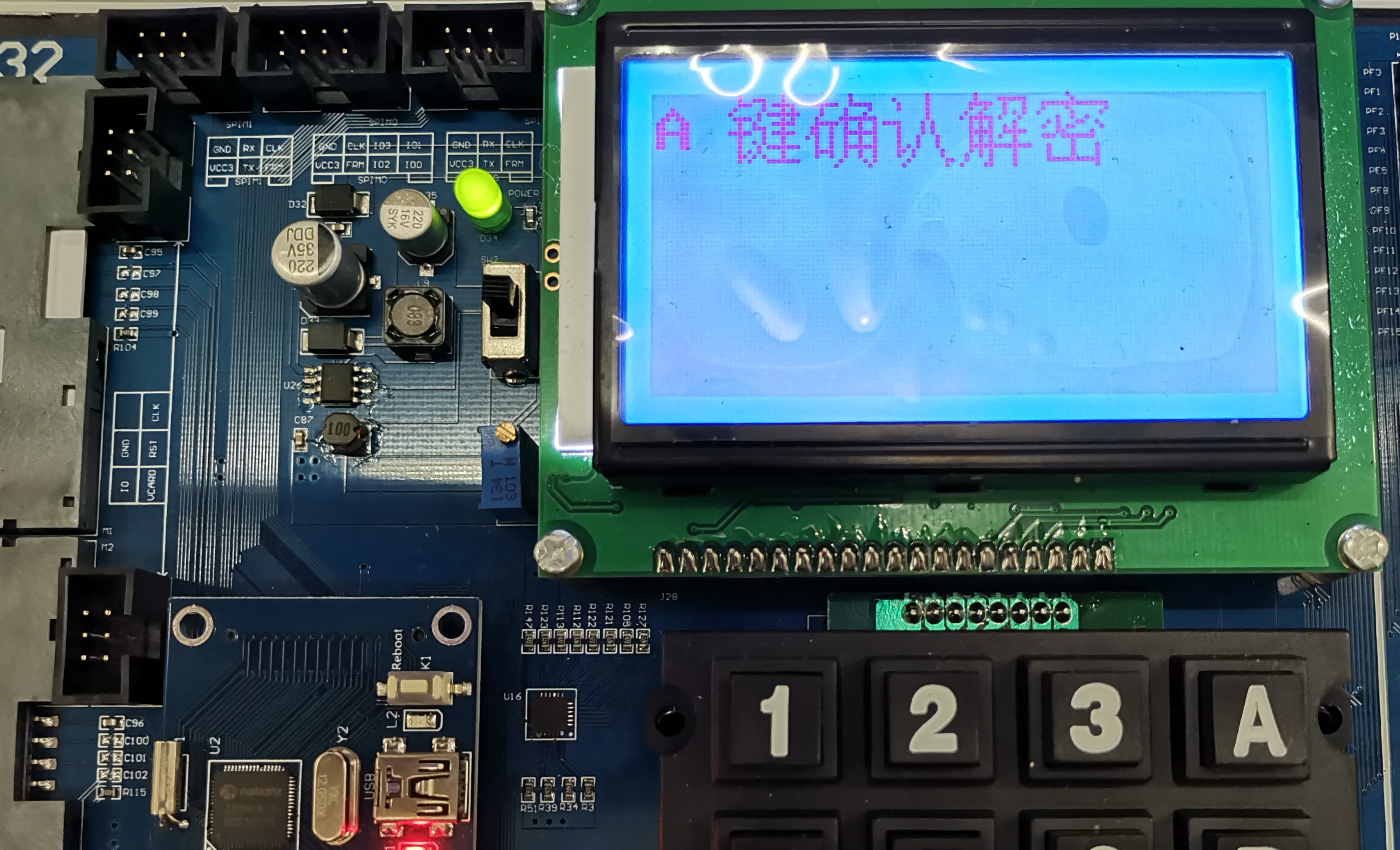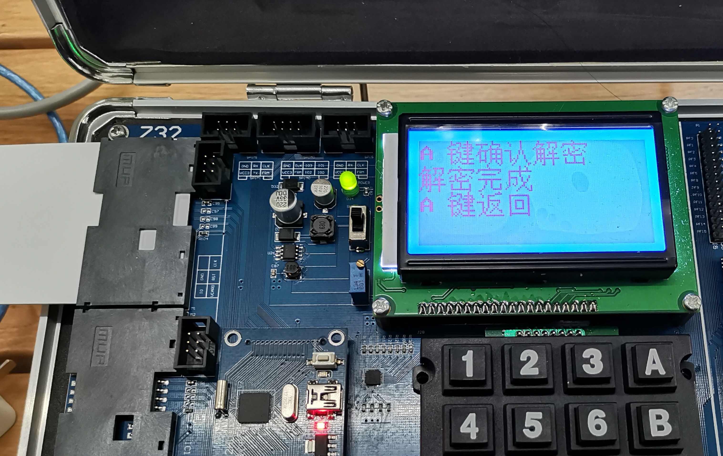 - 显示屏第二行显示“解密完成”,第三行显示“A键返回”,通过串口将“解密后的数据为:”和解密后的数据发送至PC机,发送完毕等待“A”键按下,若“A”键按下,跳转至B段程序。