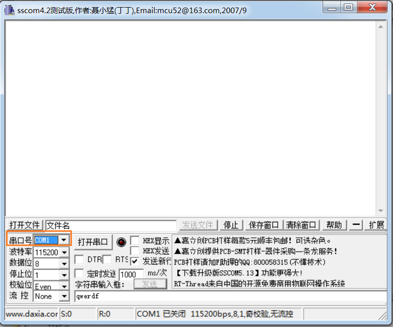 4、串口选择不能选择错误,如果选择COM1的话,打开串口之后,仍然无法成功。串口无法显示内容。