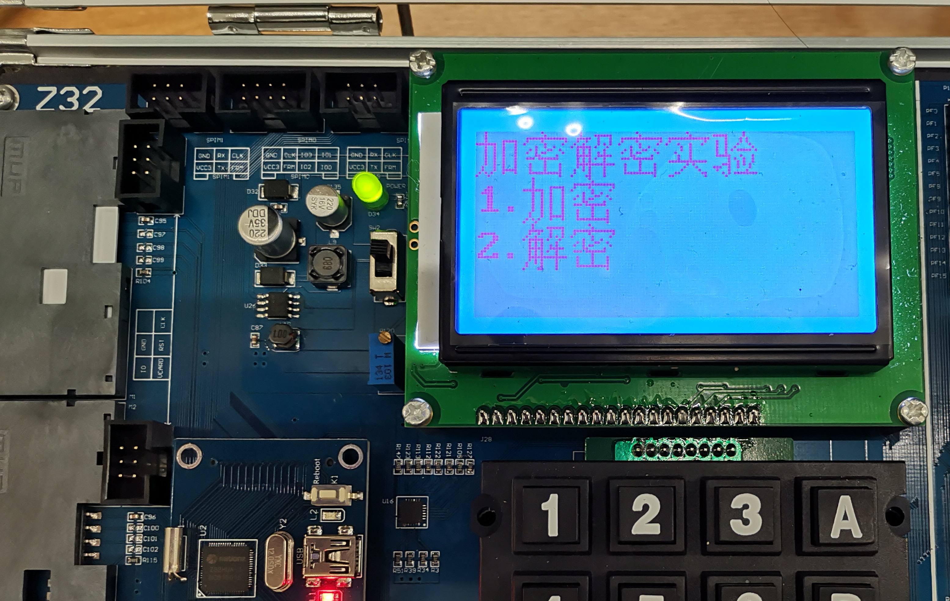 - 按下“A”键,显示屏第一行显示“加密解密试验”,第二、三行分别显示“1.加密”、“2.解密”两个选项。等待按键按下:如果“1”按下,跳转至加密程序段,如果“2”按下,跳转至解密程序段;