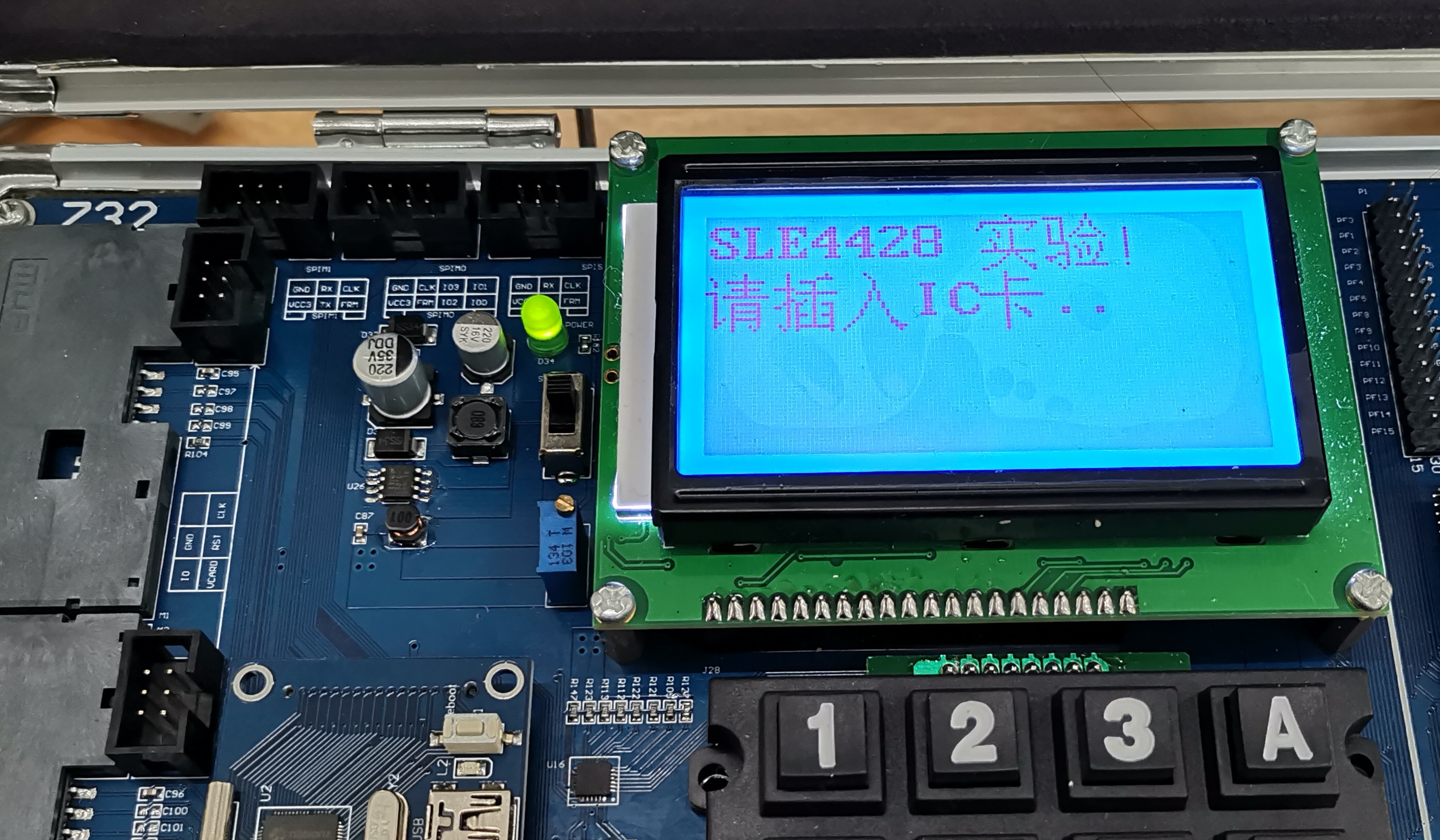 9、关闭Z32电源开关,再打开,程序自动运行,此时可以看到实验现象:显示屏显示“SLE4428实验!请插入IC卡...”。 10、插入SLE4428 IC卡,显示屏第三行显示:“用户代码为:”,第四行显示用户代码“D27600000400”。 11、如果插入错误的卡片,则显示屏第二行显示:“卡不正确”。 12、若插入了正确的卡片,显示出用户代码,再按下矩阵键盘的“A”键,屏幕第一行显示提示“按-A键校验密码”并在第二行显示两个字节的校验密码“校验0xFF,0xFF”。 13、按下矩阵键盘的“A”键,屏幕第三行显示“校验成功”,第四行显示校验剩余机会“剩余机会:8次”。 14、再按下矩阵键盘的“A”键,则屏幕第一行显示“加密解密实验”,第二、三行分别显示选项“1.加密”,“2.解密”。