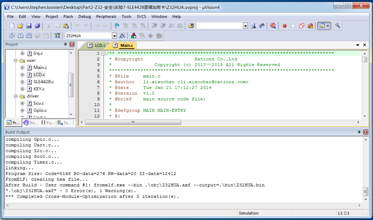 在user组下分别双击Main.c和SLE4428.c,就可以看到主函数代码和SLE4428程序的源代码。其中工程文件目录的algorithm文件夹包含了Z32HUA_ALG.ALG函数库,其中包含了国密的加解密算法相关函数库,SM1加解密函数的调用需要这个库的支持。 ==打开Main.c,介绍一下主函数,代码如下:==