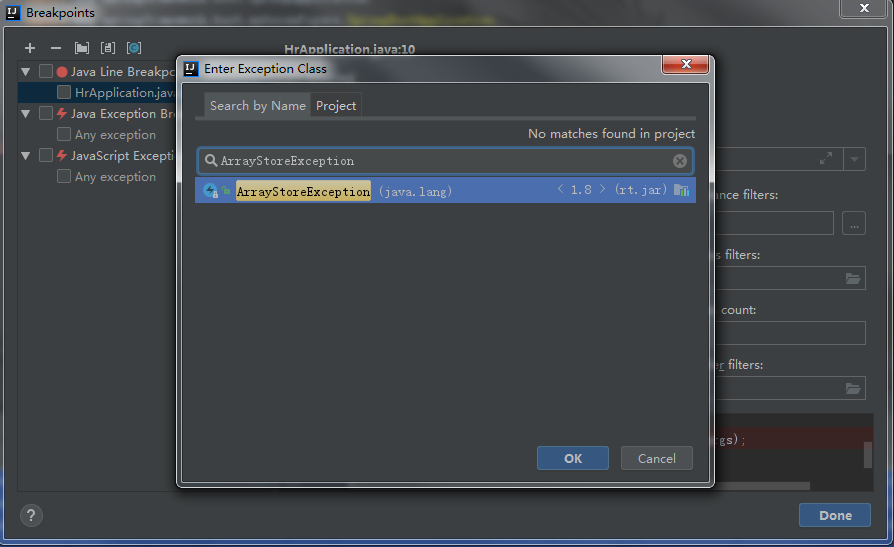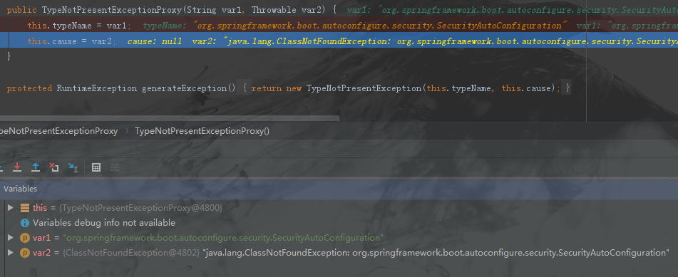 经过简单排查后,怀疑是因为jar版本冲突引起的异常,使用异常断点: