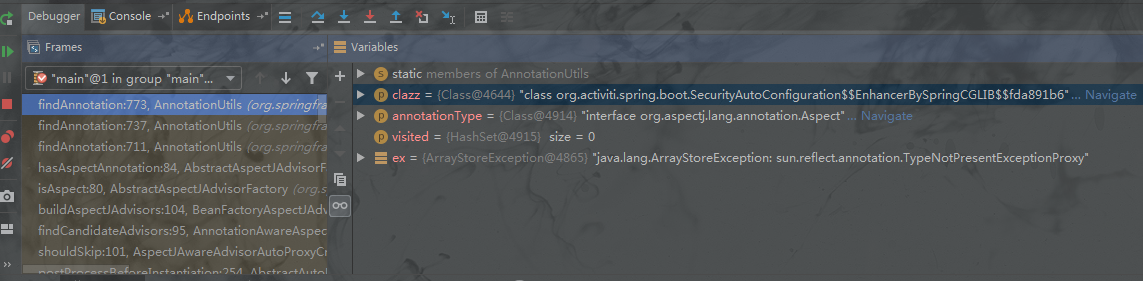 应该是从class org.activiti.spring.boot.SecurityAutoConfiguration出错,然后报错java.lang.ArrayStoreException: sun.reflect.annotation.TypeNotPresentExceptionProxy