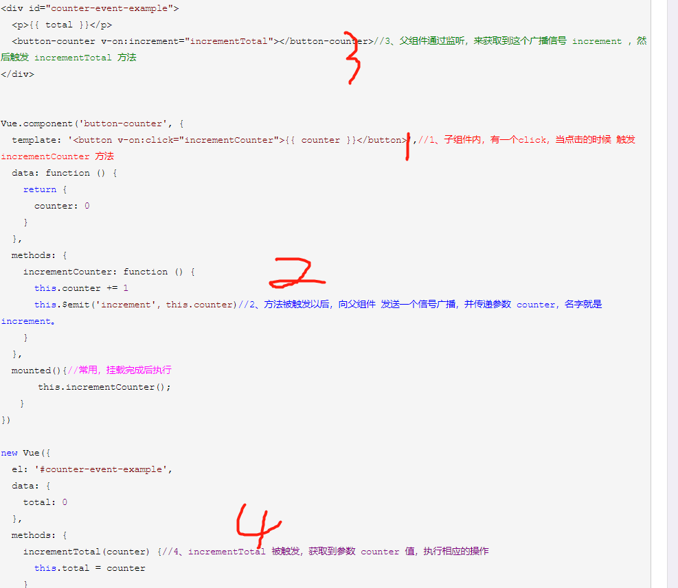 然后父组件可以监听那个事件并根据需要更新一个本地的数据属性。例如: