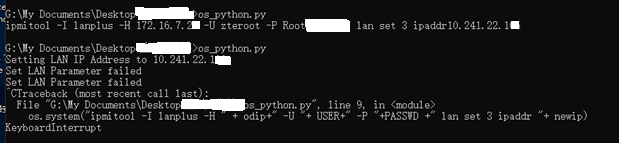 #os.system("ipmitool -I lanplus -H " + odip+" -U "+ USER+" -P "+PASSWD +" lan set 3 ipaddr "+ newip)