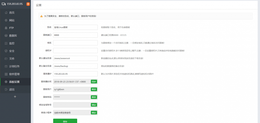 推荐大家首次进入宝塔面板前不要进行环境的安装,因为在安装环境不能更改宝塔面板的设置。推荐大家先更改宝塔面板的默认设置,编译安装环境将近一个小时。在这段时间里我们先将宝塔面板设置好提高面板的安全性。