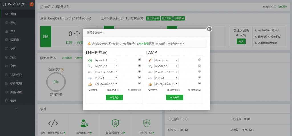 登陆后进入宝塔面板我们可以看到如下图所示,你可以选择LNMP或者LAMP进行安装。看大家网站需要什么环境进行选择。如果是生产环境推荐大家使用编译安装,如果只是测试环境选择极速安装。两者的区别是编译安装慢但稳定,极速安装虽然慢但是没编译安装稳定。
