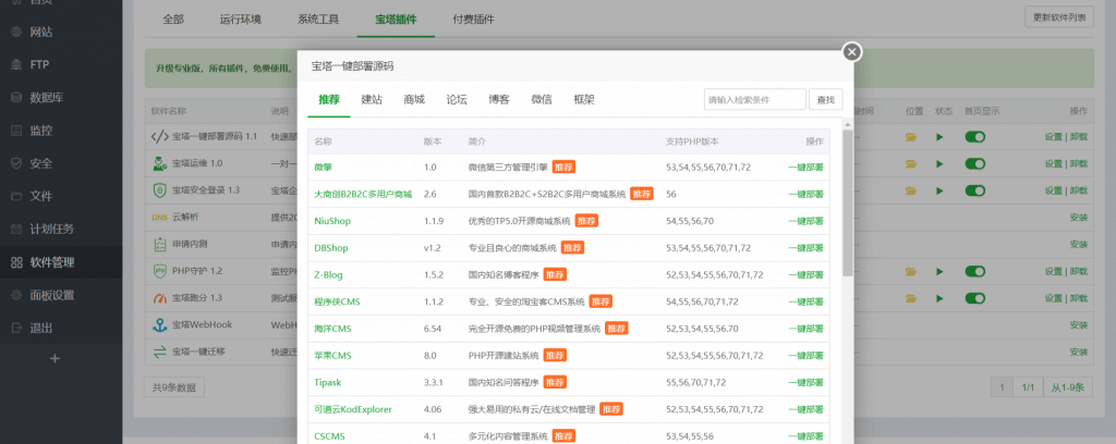 第二种在软件管理中的宝塔插件中安装宝塔一键部署源码插件进行创建网站。