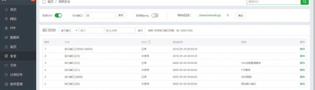 在这里你可以开启和禁用一些端口。推荐大家更改ssh端口,和禁用ping。更改FTP端口。更改phpadmin默认端口。不常用的端口可以把它关闭,等要使用了在开启。