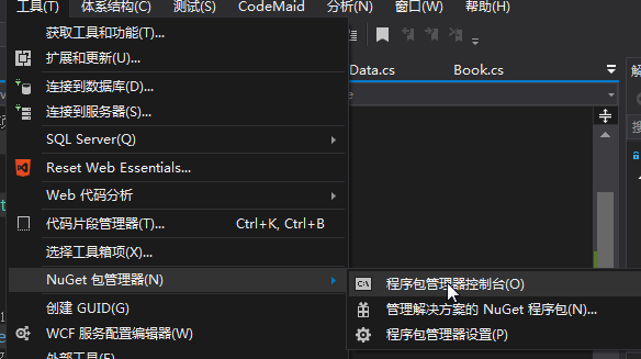 在Visual Studio 2017中打开包管理器控制台 (PMC):“工具” > “NuGet 包管理器” > “包管理器控制台”。