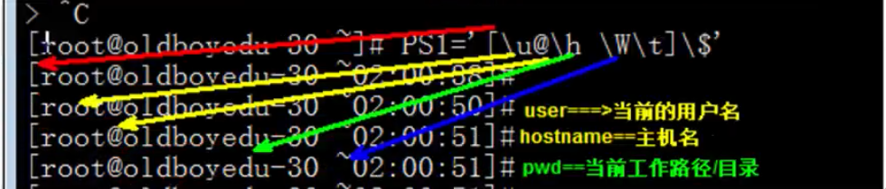 root是当前用户,oldboyedu是主机名,~代表当前路径,也是家目录